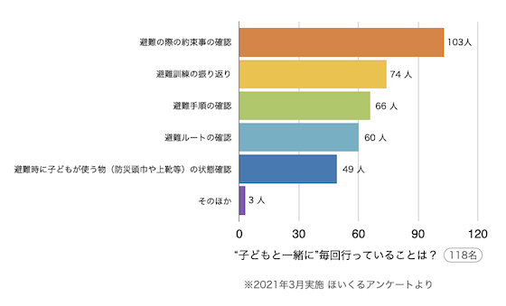 また約5〜6割の方たちが、子どもたちと「避難訓練の振り返り」「避難手段の確認」「避難ルートの確認」も実施しています。毎回必ず振り返りや確認をすることで、子どもたちの中に避難時の対応がしっかりと定着していきそうです。