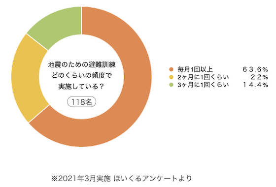 「毎月1回以上」という回答が60%以上、多くの園で毎月、地震を想定した避難訓練が行なわれているようです。