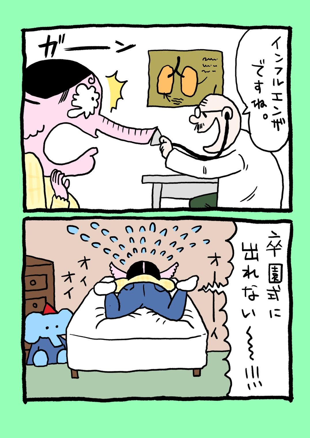 「インフルエンザですね」と、言われその診察室で号泣。明日初めて担任した子たちを送り出す卒園式なのに。