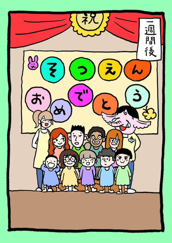 「月曜日もう一度卒園式にしよう!」って先生方が手を振って笑ってる。そしてポストの中には子どもたちからの手紙。