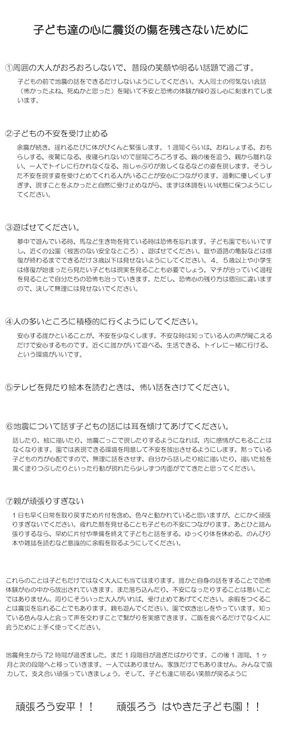 ありがとうございます。あれは、被災2日後から園を再開して数日経った日に、あるお父さんから「園長、うちの子がなんか変なんだ。暗い部屋に行けなくなったし、トイレにも一人で行けない。親から離れられなくなった。これはやっぱり地震のせいなのかな?どうしたらいいんだろう」と相談を受けたことがきっかけでつくったんです。