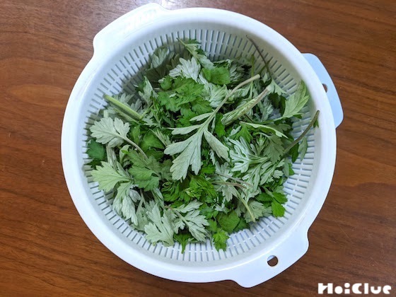 摘んできた葉は、土やほかの雑草などを取り除き、しっかりと水で洗います。この時、茎の部分がついていたら硬いので取り、柔らかい葉の部分だけを残します。