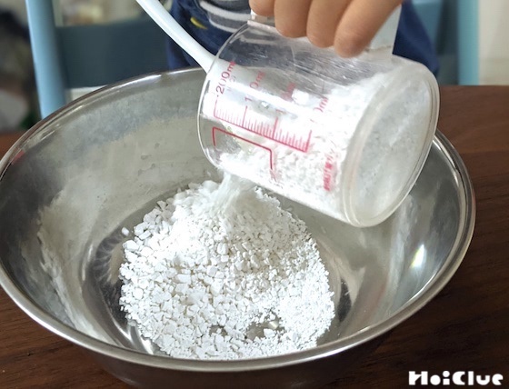 3、少しずつ水を加えながら、スプーンなどを使って、なめらかになるまでしっかり混ぜます。子どもの力だけで混ぜるのが大変なときは、大人と交代しながらやってみてください。