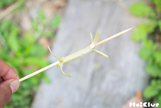 6. 丸まったら、竹ひごを通しましょう。