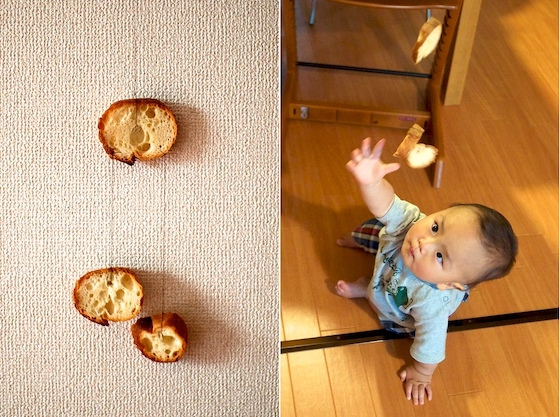 育休明けに作ったのが、天井から吊るすフランスパンでできたモビール。保育園から帰宅してお腹をすかせている子どもが遊びながら小腹も満たせるおもちゃです。