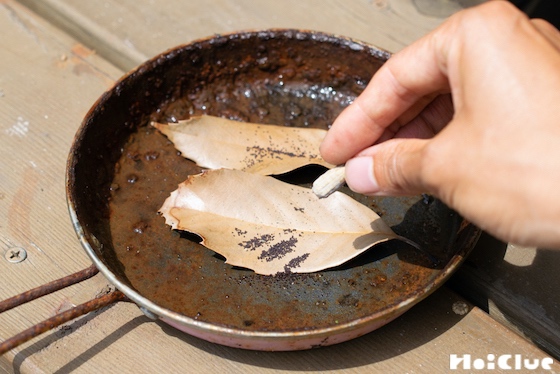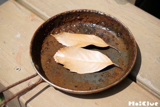 フライパンの上で、ステーキ(枯葉)をジュージューと焼いて…。