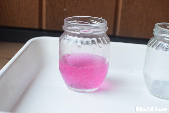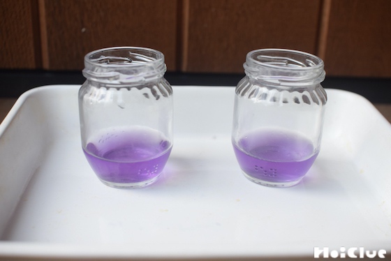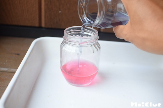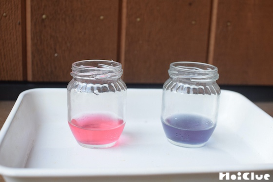 7. 色水を2つの瓶に分けて入れましょう。