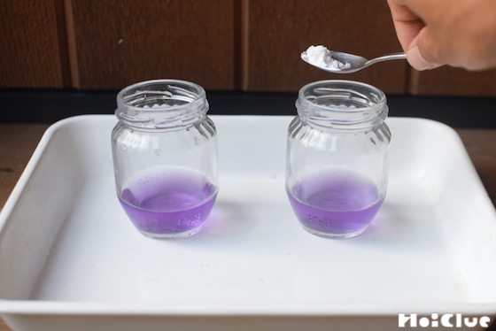 酸性のクエン酸ではピンクになるけれど、アルカリ性の重曹ではどうなるのかな?