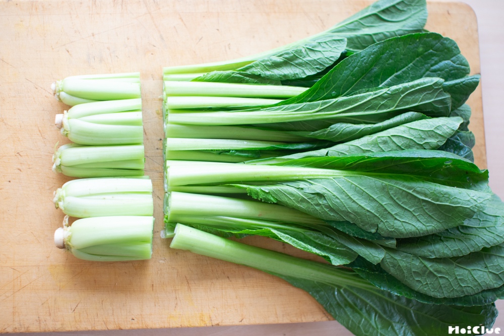 1. 買ってきたコマツナを、根元から3cmくらいのところでカットします。