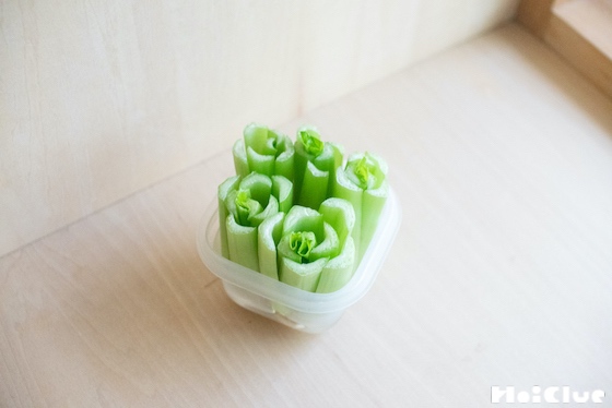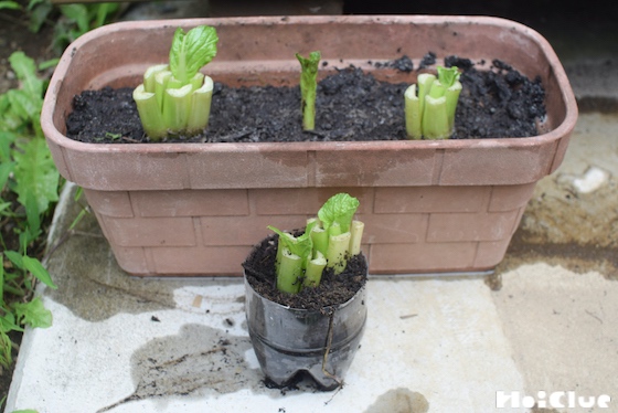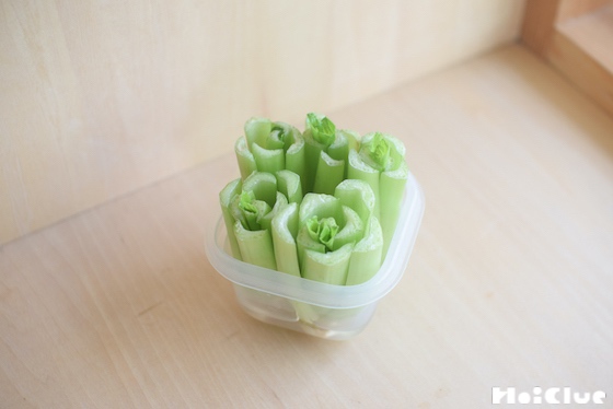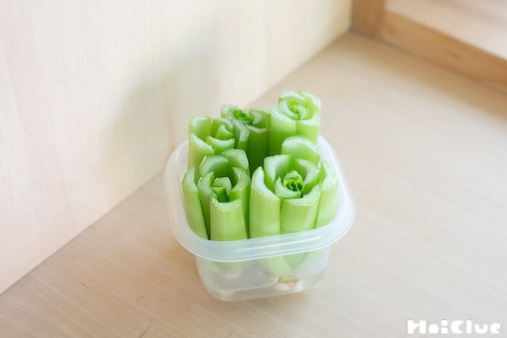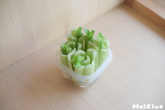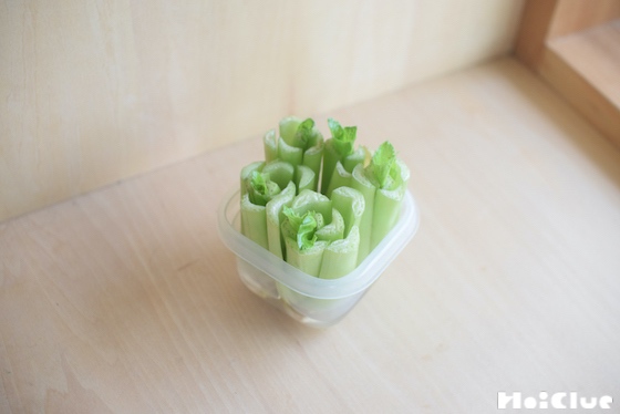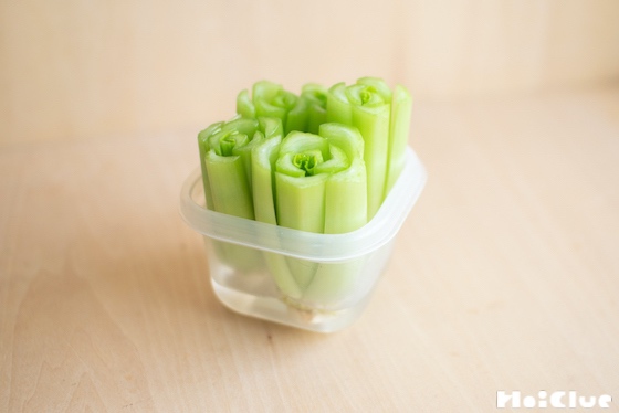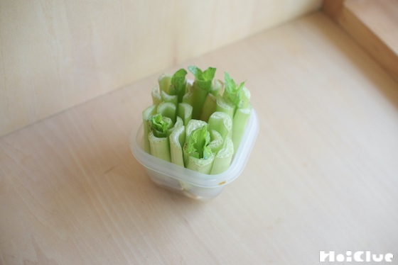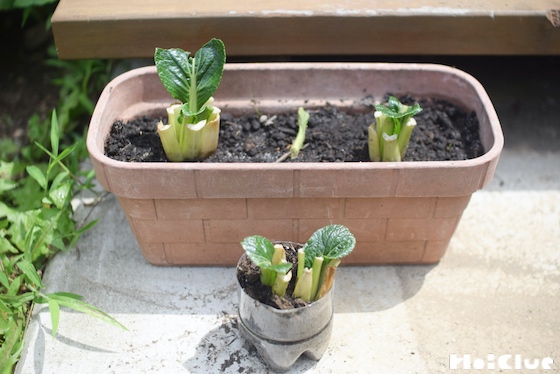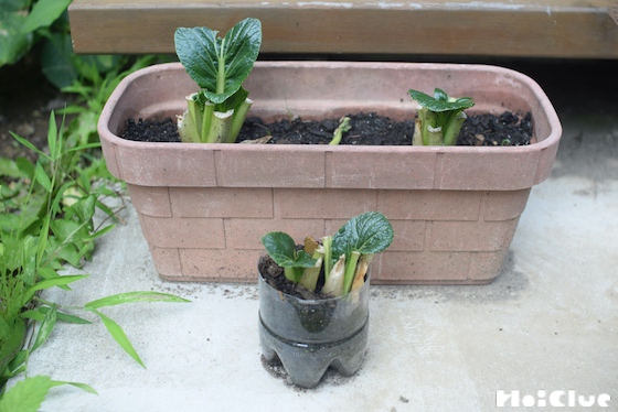 母「買ってきたコマツナカットして、根を水につけたのよ!葉が育ったら、地植えできるから試してみて!」