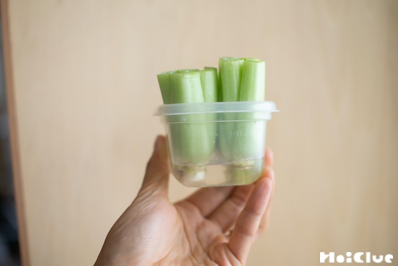 2. 容器に底から1cmくらい水をはり、コマツナの根元をひたします。