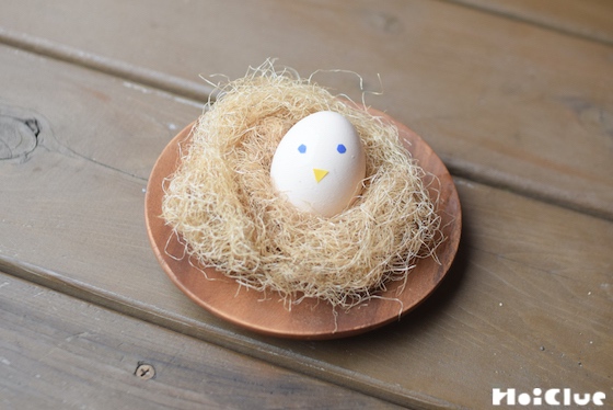 6. 卵の殻に、テープや折り紙で作った目とクチバシを貼った、ヒナを置きました。