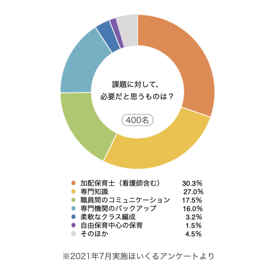 2)の回答で現在感じている“難しさ”では、保育者不足、対象児に対する専門的な知識の不足や対応への判断の不安をあげていた方がとても多く、「必要だと思うもの」は、それらの課題を反映した結果となりました。