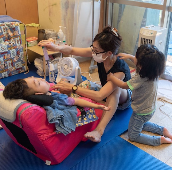 喀痰吸引の管を、入ってきた子どもがいじったりすることはないのかと聞かれますが、「大事なものだから引っぱらないよ」と伝えれば、0歳児でもさわらないようになります。医療ケア児が自宅では小さい妹や弟と問題なく過ごしているのと一緒です。