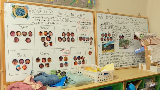 ブルーベリー摘みの案内と、どの日に行くかを意思表示するボード。