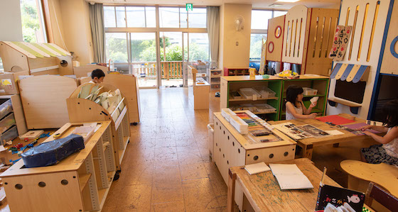 3~5歳児の保育室。個人ロッカーやランチのテーブルはホールに置かれているため、端から端まで遊びに使える。