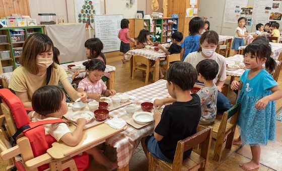うーたん保育園の医療ケア児クラスことり組。看護師による経管栄養でヨーグルトを補給している様子を、脇で見ているのは幼児クラスの子ども。