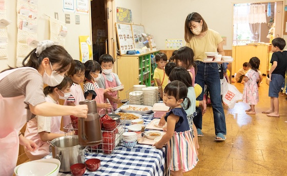 昼食の盛りつけは、気がついた子どもが手伝う。強制はしないが、だれもが年に1回は参加している。