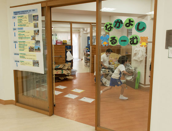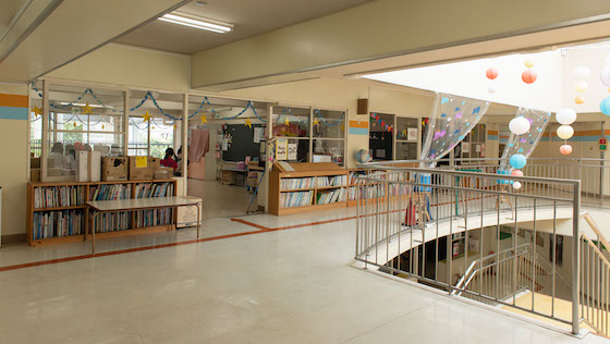 通常クラスの部屋も廊下に面した壁はガラスになっており、廊下から部屋の中がよく見渡せます。新型コロナの流行を機に入り口の戸を外してさらに開かれた空間にしました。子どもたちがほかのクラスの様子を見て学んだり交流したりしやすいですし、フリーの先生が、必要に応じてヘルプに入っていきやすいのもメリットです。