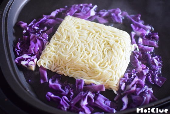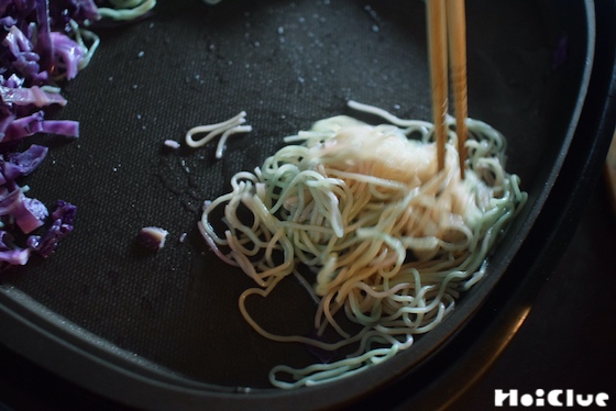 2. 3分ほど炒め、水が紫色に変化したら(すくってみると分かりやすいです)焼きそばの麺を投入。