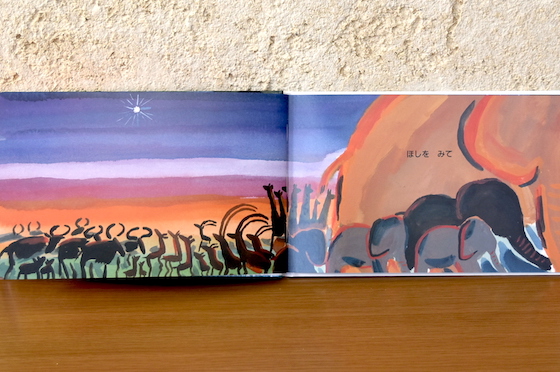 今日もどこかで星を見上げているだろう動物たちがページいっぱいダイナミックに、おおらかに、生き生きと描かれています。