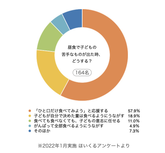 ・「残さず食べる」がベースになっている。食べる量、食べる物を、ある程度子どもに主体性を持たせるやり方を取り入れても良いと思う。