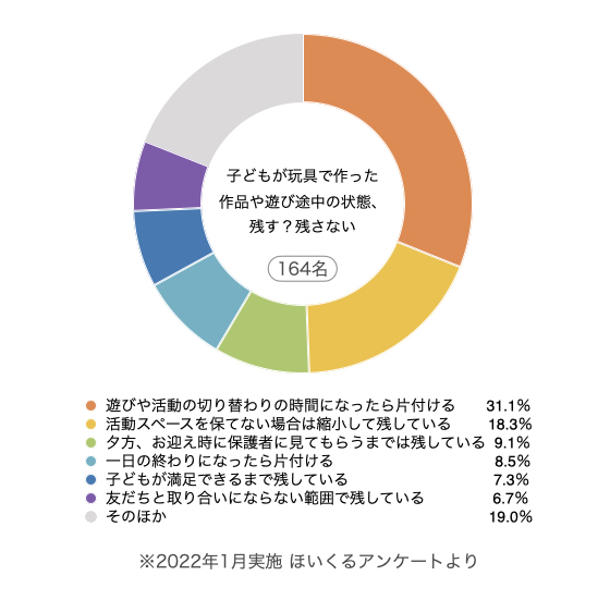 中でも週末(金曜が多かったです)まで残す方からは、期間の途中で子どもの遊び(作品)がさらに発展した、子どもたち自身も満足し期限がきたら自ら片付ける、という声がありました。
