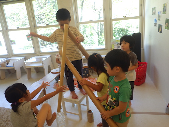 翌日、テントを立てるために、けやき組(5歳児)の子が一人、かえで組(4歳児)の子が一人、つばき組(3歳児)の子が三人集まって、ペットボトルと布と紐とを用意し、立てようとしました。