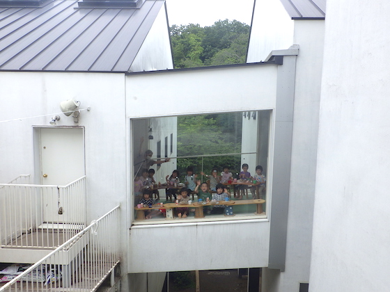 「あ、竹でやればいいじゃん!」と窓に張り付いて、園庭を見下ろす姿。
