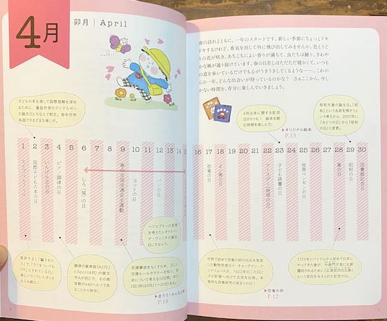 12ヶ月のカレンダーとともに行事や記念日の由来、「子どもの姿」を見つめるコラムといった読みものも充実しています。