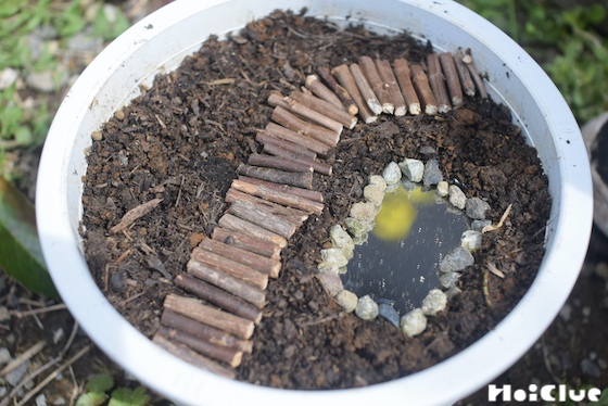 100円ショップに行ったら、ちょうど良い大きさの鏡も見つかったので、娘と一緒に、ミニチュアガーデンづくりを楽しんでみました。