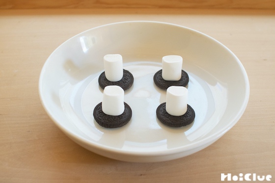 電子レンジが無い場合、熱湯に縦にしたマシュマロの下半分を30秒ほど浸して表面を溶かし、その後クッキーにギュッと押し付けると、マシュマロとクッキーがくっつきます。