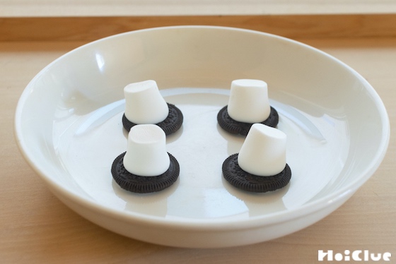 1. お皿の上にクッキーを並べ、上に一つずつマシュマロを立てて置きます。
