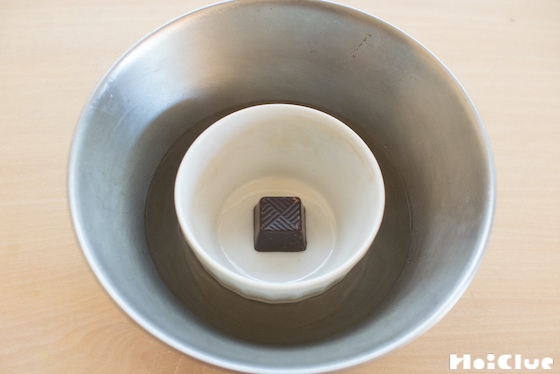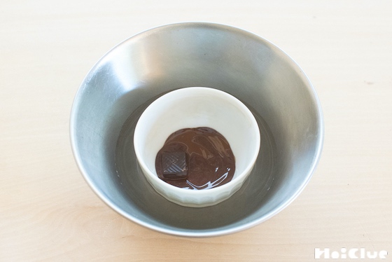 4. 小さなボウルに少量の熱湯を入れ、その中に小皿に入れたチョコを入れます。