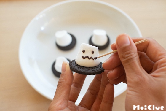 7. つまようじを筆に、「6」で溶かしたチョコを絵の具にして、「3」のマシュマロに顔を描きましょう!