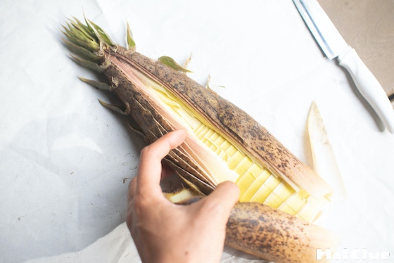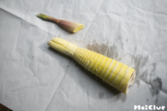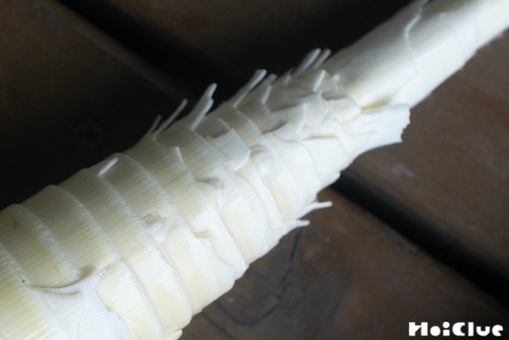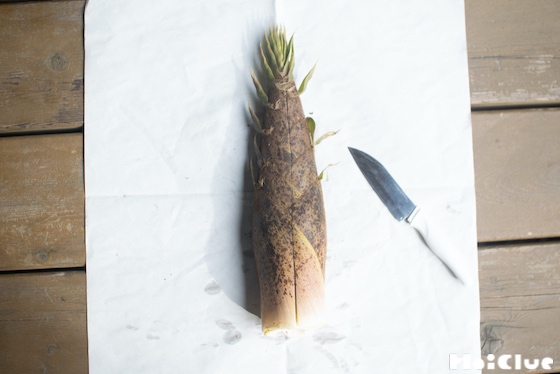 写真のように、タケノコの皮の上から、一本切れ目を入れます。
