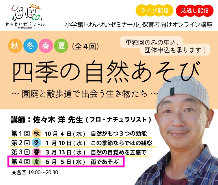佐々木洋隊長が講師としてお話される講座、『四季の自然あそび』〜せんせいゼミナール〜。6月には「雨であそぶ」をテーマに開催されます。