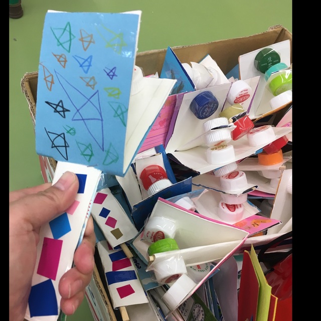 牛乳パックの真ん中に割り箸を一本、テープで貼る。