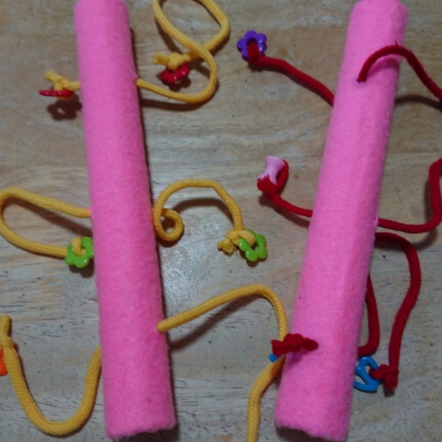 - ビーズの代わりに鈴など音がなるものを付けたり、紐の長さや種類を変えたりすると耳や手を使って色々な感覚を楽しめそうです。
