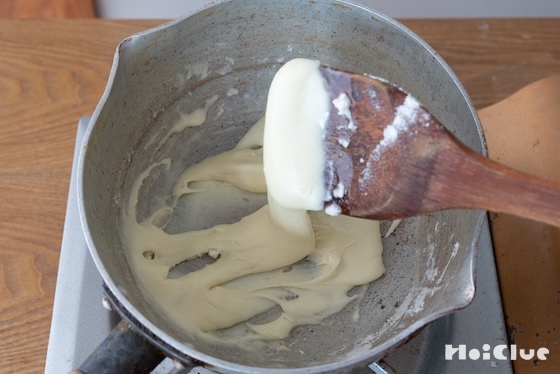 3. しばらく混ぜていると、粉っぽさがなくなります。この状態になったら、練乳を入れ、さらに混ぜましょう。