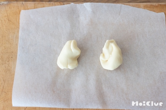 1. ここからは、子どもたちがじっくり楽しめる作業です!手で触れる温度になったら、手でちぎり二つに分けます。