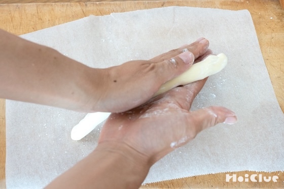 2. 打ち粉をまぶして、両手で飴の素を伸ばし、細長い形にしていきます。少し固い粘土のような触り心地で、簡単に長くすることができますよ。
