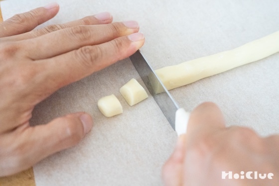 5. 長く伸ばさず、小さくちぎってコロコロと丸めたり、長く伸ばしたものを包丁でカットすれば、一口サイズの千歳飴キャンディを作ることもできます。(包丁を使用する際は、子どもの姿に合わせて大人が行うなど怪我に十分気をつけてください。)
