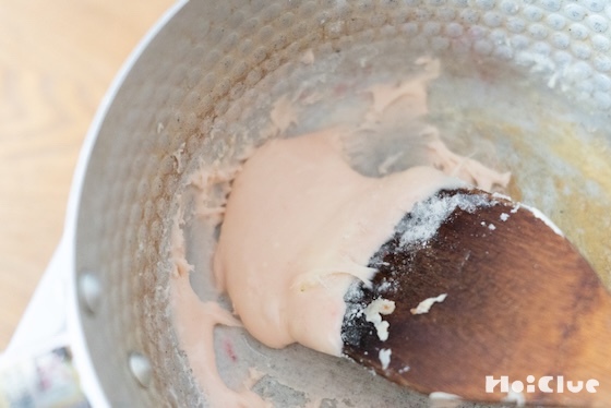 工程「3」の練乳を入れるタイミングで、少量の食紅を入れ、混ぜます。食紅は爪楊枝の先などにつけ、少しずつ入れるのがおすすめです。飴の素がピンク色に染まれば、紅色の千歳飴の素の出来上がり。