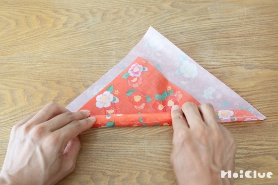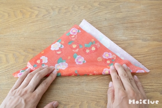 1. ワックスペーパー(今回は250×218mmのものを使用)を菱形に置き、中心に千歳飴を置きます。ペーパーに飴がくっつかないように、飴に打ち粉をしておくのがポイントです。