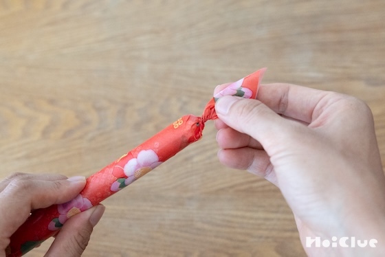 6. 両側をねじったら、ラッピングの完成です!端を開けて、ペーパーを持ったまま、千歳飴を食べることができます。