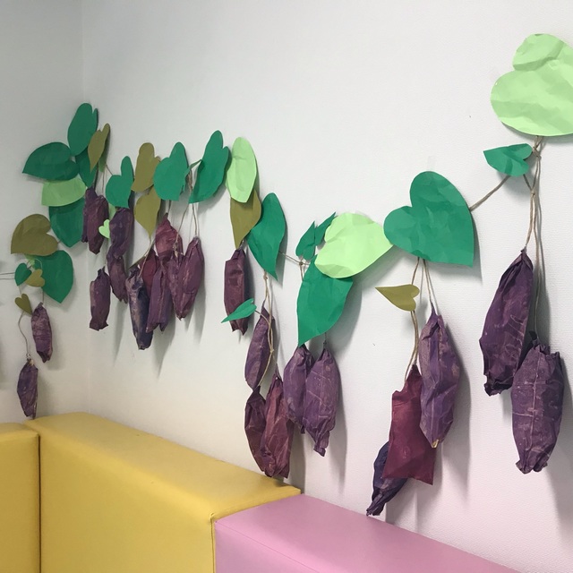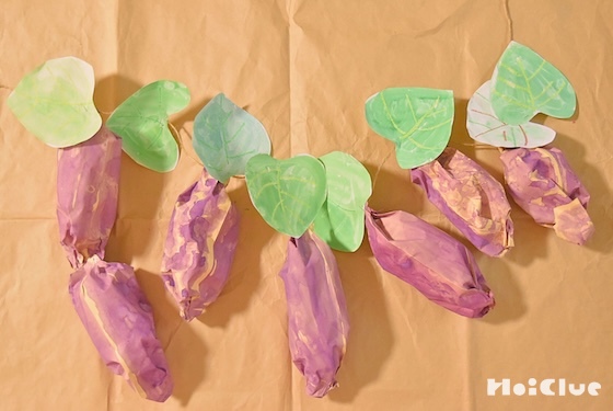 - 完成したものを壁面に飾ったり、箱などに入れてお芋掘りゲームにしたり、友だちやグループごとに作ったものを繋げて長いツルの芋にしたりと、いろいろな楽しみ方ができるかもしれません。