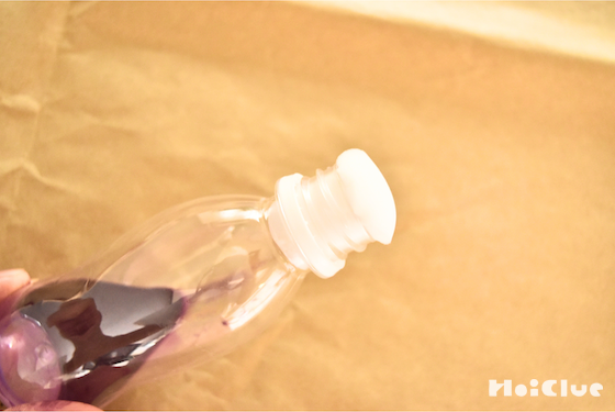 ペットボトルに絵の具を入れ、ボトルの飲み口にメラミンスポンジを入れる。