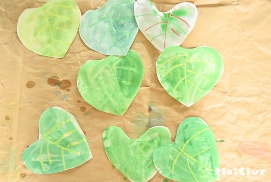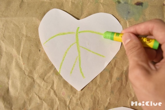 1. さつま芋の葉の形に紙を切り、子どもたちの発達に合わせて描けそうなら、葉っぱの葉脈などもクレヨンで描いてみる。「さつま芋の葉っぱってどんな形だったかな?」と子どもたちと話しながら作っていくのがおすすめ。