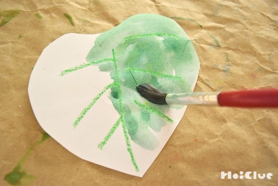 2. クレヨンの上から絵の具で葉の色を塗り、しばらく乾かす。